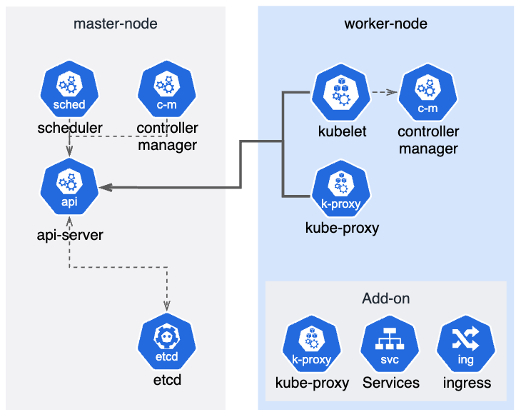 부가적으로 애드온 구성요소로 네트워크 인터페이스인 서비스(Services), DNS 서버(coredns), 인그레스(Ingress) 등이 있다. 마스터 노드는 멀티노드로 구성했을때, 내부 구성요소들이 무조건 동일 인스턴스에서 동작하지 않아도 되는데, 이는 가용성 때문이다. 마스터 노드(컨트롤 플레인)에서 etcd, kube-apiserver 는 여러 인스턴스를 동시 활성화해서 병렬로 실행해 가용성을 높일 수 있다.
